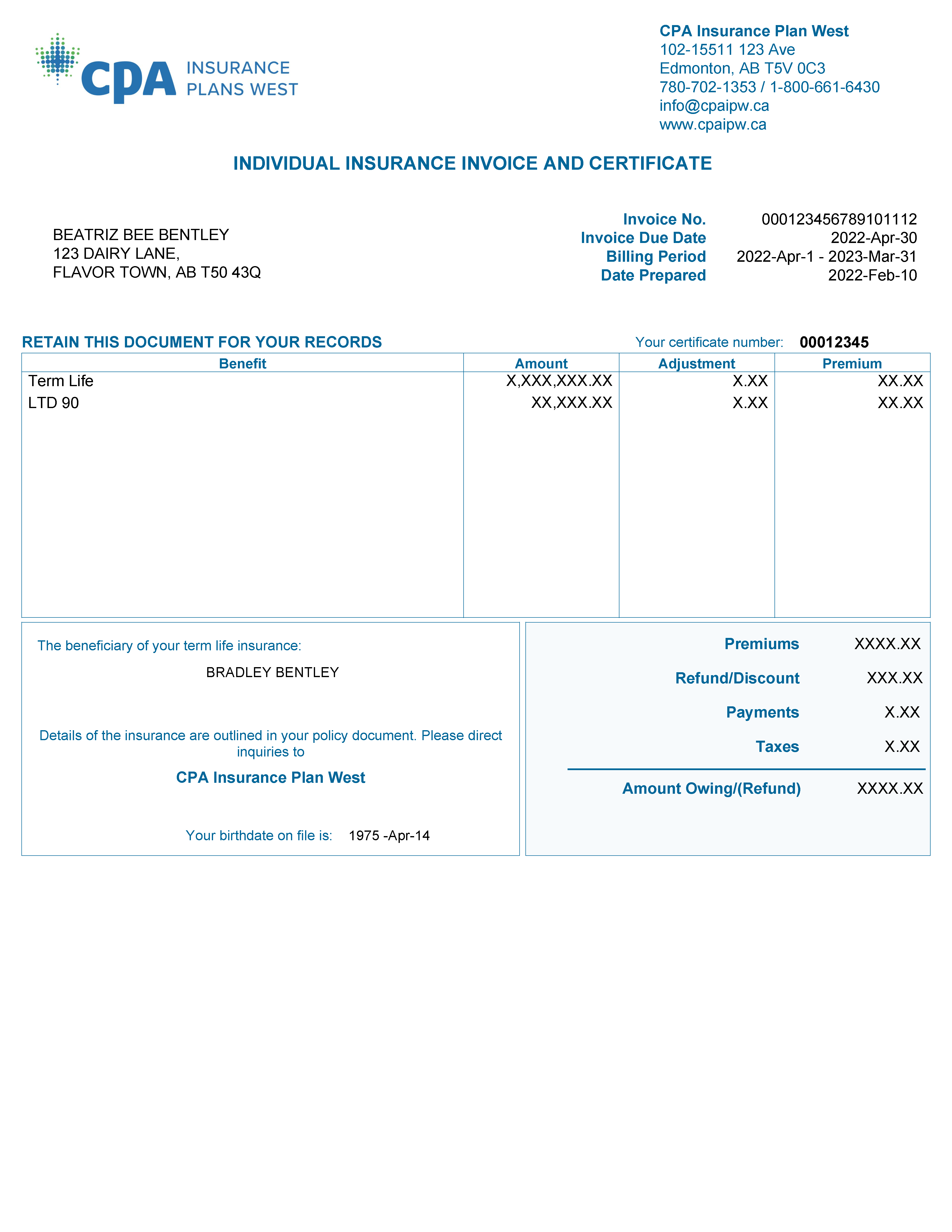 The name stated on the following example invoice is Beatriz Bee Bentley. Entering this name as Beatriz B Bentley, Beatriz B. Bentley or Beatriz Bentley will NOT be accepted. The name must be entered exactly as stated on the invoice.